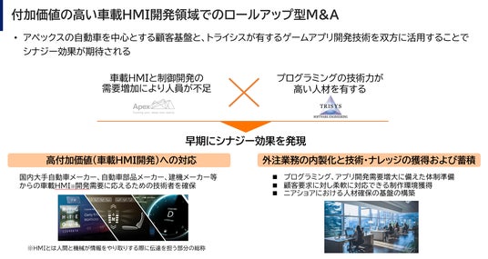 当社グループにトライシスを迎えることにより、アペックスは、トライシスが有するゲームアプリ開発技術を活用でき、トライシスは、アペックスの自動車を中心とする顧客基盤を活用することで、双方にシナジー効果が期待されるため、株式取得に至りました。