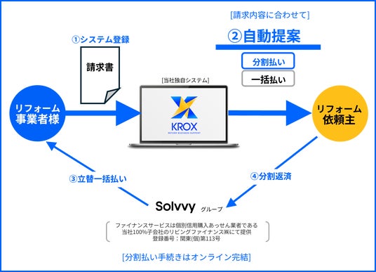 アフターサービスを起点にしたストックビジネスコンサルティングを展開するSolvvy株式会社(本社:東京都新宿区、代表取締役社長:安達慶高、以下「当社」)は、住宅リフォーム工事向けSaaS「KROX」を通じて、工事代金の分割払い決済(カスタマーファイナンス)機能の提供を開始いたしました。
