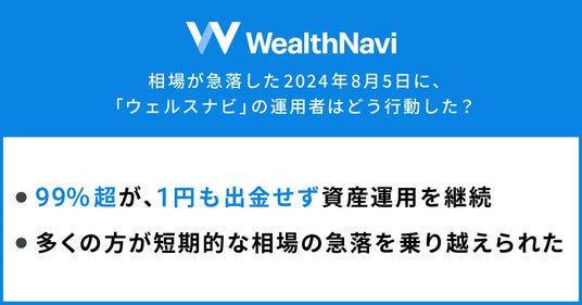 預かり資産・運用者数 国内No.1ロボアドバイザー(※1)「WealthNavi(ウェルスナビ)」を提供するウェルスナビ株式会社(本社:東京都品川区、代表取締役CEO:柴山和久、以下「当社」)は、相場が急落した2024年8月5日における運用者の行動データを検証しました。