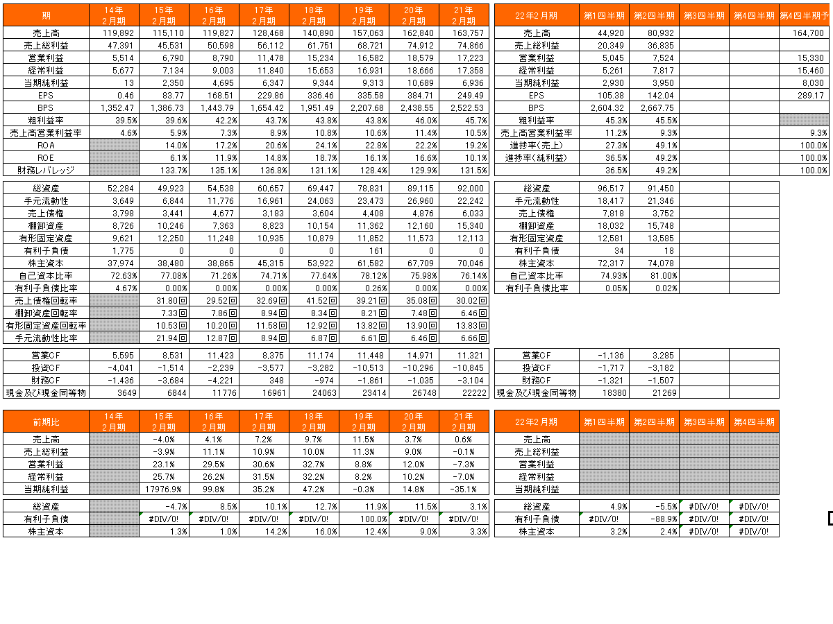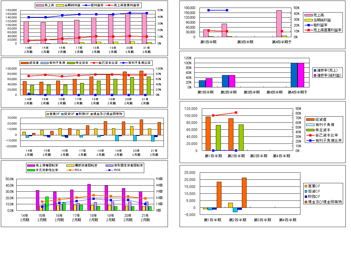 現状、予想PER12.34倍、PBR1.33倍、予想ROE10.83%、予想配当利回り3.08%、自己資本比率は81.00%で有利子負債比率0.02%の超健全経営。進捗率と11月の月次から考えると、通期では少し下に振れそうだ。過去の不景気のときも売上が落ち込んでいたので景気がよくなると売上が伸びてくると思う。ポイントはアジアかな。好調なときに出店攻勢を強め第二の柱に鍛えることできれば、先は明るいと思う。