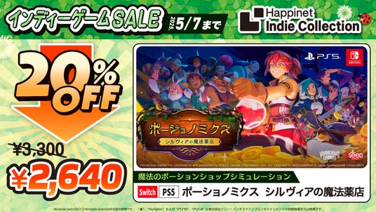 株式会社ハピネット(本社:東京都台東区、代表取締役社長:榎本誠一、証券コード:7552)は、おもしろいインディーゲームを世界中からセレクトして発売するゲームレーベルHappinet Indie Collectionタイトルのダウンロード版について、2025年5月7日(水)までセールを実施します。魔法のポーションショップシミュレーション『ポーショノミクス シルヴィアの魔法薬店』含む、全5タイトルが特別価格でお求めいただけます。