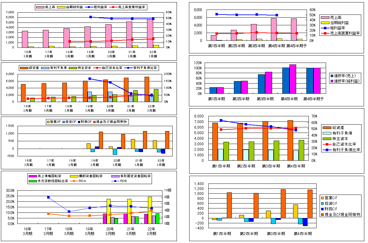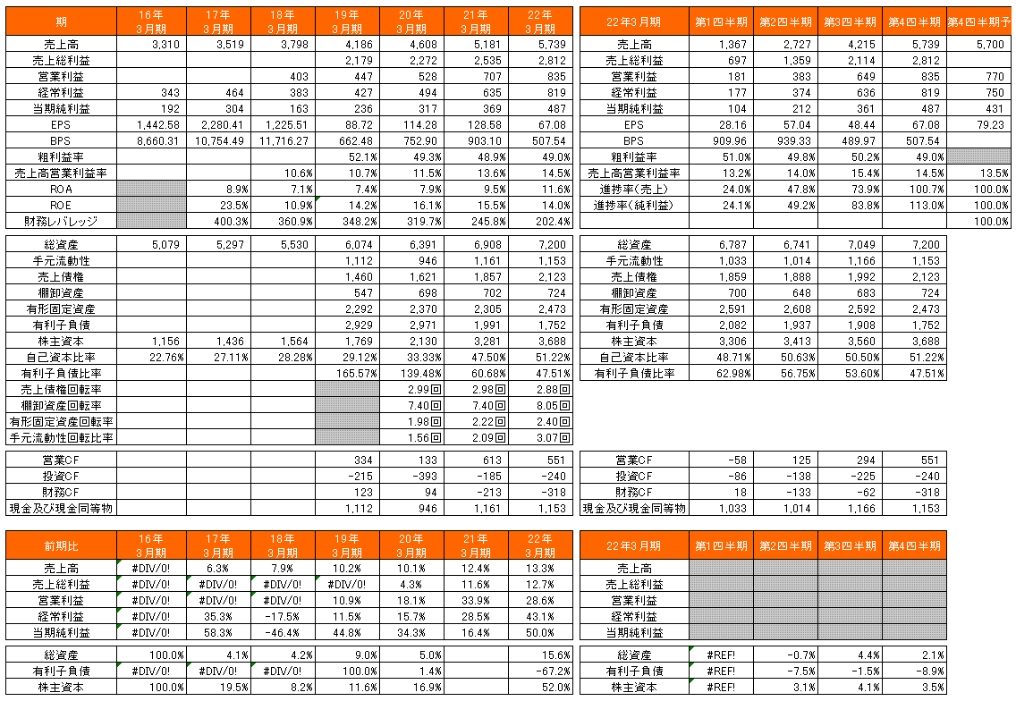 過去の経営成績を見ると、毎年6~13%の増収を継続し、粗利益率は約49%を維持している。売上高営業利益率は、集計できる18年3月期の10%から22年3月期には14.5%まで上昇している。財務面をみると、有利子負債が3年で約40%減少し、株主資本比率が50%台に突入している。潤沢な営業キャッシュフローがあるからこそなせる業か。支払利息が減るので経常利益アップにつながるので良い傾向だと考えます。