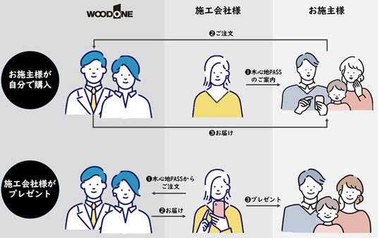 また、WOODONE NETからお施主様ごとに邸別の「木心地(きごこち)PASS」を発行して、専用ウェブサイトからお申込みを行います。お施主様がご自分で購入するか、施工会社様がお施主様にプレゼントするか選択することもできます。施工会社様の家づくりに環境指標を数値化し、お取引先様とともに新たな共通価値を創造していきます。