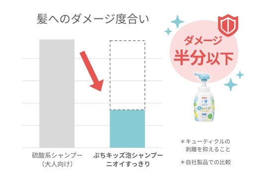 硫酸系シャンプー(大人向け)よりも髪へのダメージを半分以下へカット 「ぷちキッズ 泡シャンプー」は、髪や地肌にやさしいアミノ酸系の洗浄成分(ココイルメチルタウリンNa)を主成分として配合。硫酸系シャンプー(大人向け)と比べ、髪へのダメージを半分以下へ抑えることを実現しました(※8)。高洗浄力でありながら低刺激なため、大人と比べて毛髪の太さが細く、地肌のバリア機能が未熟な子どもにおすすめの商品です。