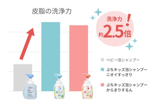 ベビー用シャンプーの約2.5倍の洗浄力!(※6) ベビー用シャンプーと比べて約2.5倍の洗浄力がある(※6)「ぷちキッズ 泡シャンプー」は、汗や皮脂の洗浄に特化しています。さらに、子どもの頭の気になるニオイをケア(※7)できるよう設計しました。