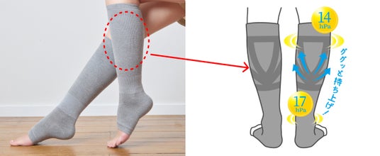 足首部分はゆったりとして脱ぎ履きしやすく、しっかりとサポートが必要なふくらはぎは、独自の編地によって下からググッと持ち上げる段階着圧設計を採用。キツイ締め付けがツライ妊娠期から産後まで長く履き続けやすく、脚をスッキリ引き締めます。