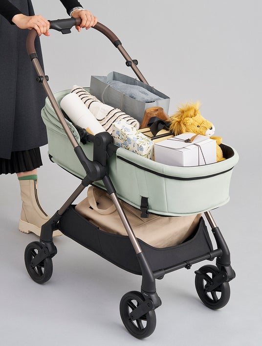 赤ちゃんがベビーカーに乗っていない時は、コット内に15kgまで荷物を積載可能(※6)。シート下のカゴとあわせて最大20kgまで荷物を運べます。