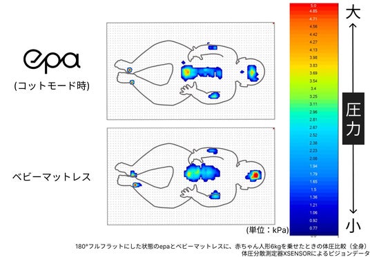 ※5 180°フルフラットにした状態のepa(画像上)とベビーマットレス(画像下)に、赤ちゃん人形6kgを乗せたときの体圧比較(全身)体圧分散測定器XSENSORによる当社データ