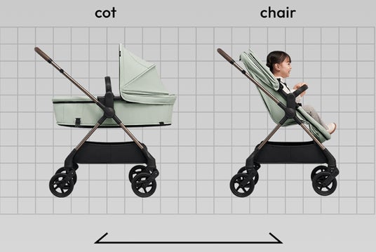 面倒なシートの付け替えなしに、「コットモード」と「チェアモード」の切り替えが可能です。「コットモード」は0ヵ月から、「チェアモード」はお子さまの首が座り、お座りできるようになったら背もたれを起こして使用でき、赤ちゃんの成長や外出シーンに応じて使い分けいただけます。