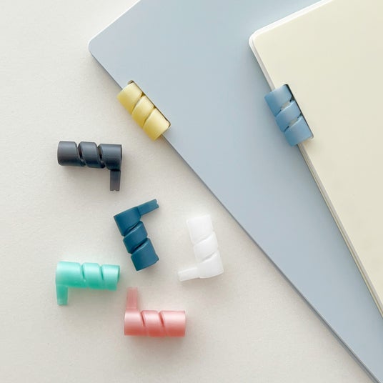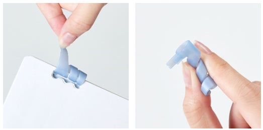 リングはやわらかい材質で「らせん形状」になっています。突起を引っ張るとスルスルと外すことができ、リングの端から巻き付けるようにくるくると回転させることで取り付けできます。この「やわらか らせんリング」はこれまでにない新機構です。