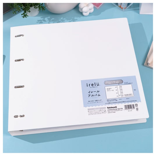 「ireluバインダー」は大容量の収納が可能な構造で、中身を目立たせるシンプルなデザインのバインダーです。「ireluアルバム」と同様にたくさんのグッズを入れても安定するよう、厚手の表紙にはバインダー内の金具を固定する4つのストッパーを採用しています。背幅が約60mmで多くのグッズを収納でき、500枚のコピー用紙を収納しても安定して自立します。本体のカラーは収納したアイテムを引き立てるため、白を採用し、さらにインテリアにも馴染むよう、シンプルなデザインに仕上げました。既製のA4サイズやA4変形リフィルにも対応しており、すでにA4ワイドサイズのバインダーシリーズをお使いの方は、現在お使いのリフィルをそのまま移行することが可能です。