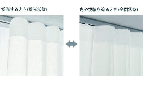 生地のドレープの意匠とブラインドの機能を両立させたタテ型ブラインドは、一般的な従来のタテ型ブラインドとは大きく違う。閉めた状態で調光ができる点は、住環境におけるプライバシーの確保などを実現させつつ、開閉の手間を無くすなど、便利で有効である。調光操作の部分や吊り元周りを想定した設計などもよく検討されており評価できる。