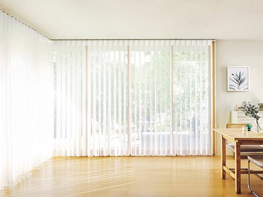 「エアレ」は、採光と眺望、出入りを自在にコントロールできる調光タテ型ブラインドです。ドレープとレースが一体になった生地をU字状に取付けることで、カーテンのような美しさと、タテ型ブラインドのスタイリッシュさを同時にかなえます。バトンで生地を回転させるだけで簡単に採光と全閉が調整できるため、プライバシーを確保しながら、お部屋に光を取り入れることができます。