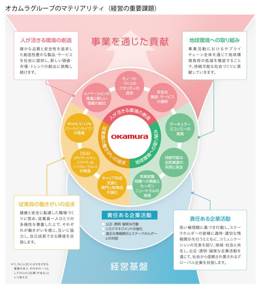オカムラグループは、パーパスである「人が活きる社会の実現」に向け、「豊かな発想と確かな品質で、人が活きる環境づくりを通して、社会に貢献する。」をミッションとして、経営方針を原点に企業の社会的責任を果たしています。ステークホルダーの皆さまからの期待や社会の要請に対しグループ一体となって応えていくために、「人が活きる環境の創造」「従業員の働きがいの追求」「地球環境への取り組み」「責任ある企業活動」の4つの観点から経営の重要課題を特定。具体的な行動計画として各課題に対する中期目標およびKPIを設定し、取り組みを推進しています。