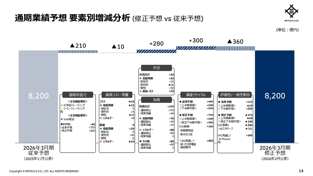 「基礎収益力」は、Vale配当、FVTPLの増益などはありましたが、化学品トレーディング、コーヒートレーディングなどの減益を主因に、210億円の減益を見込みます。