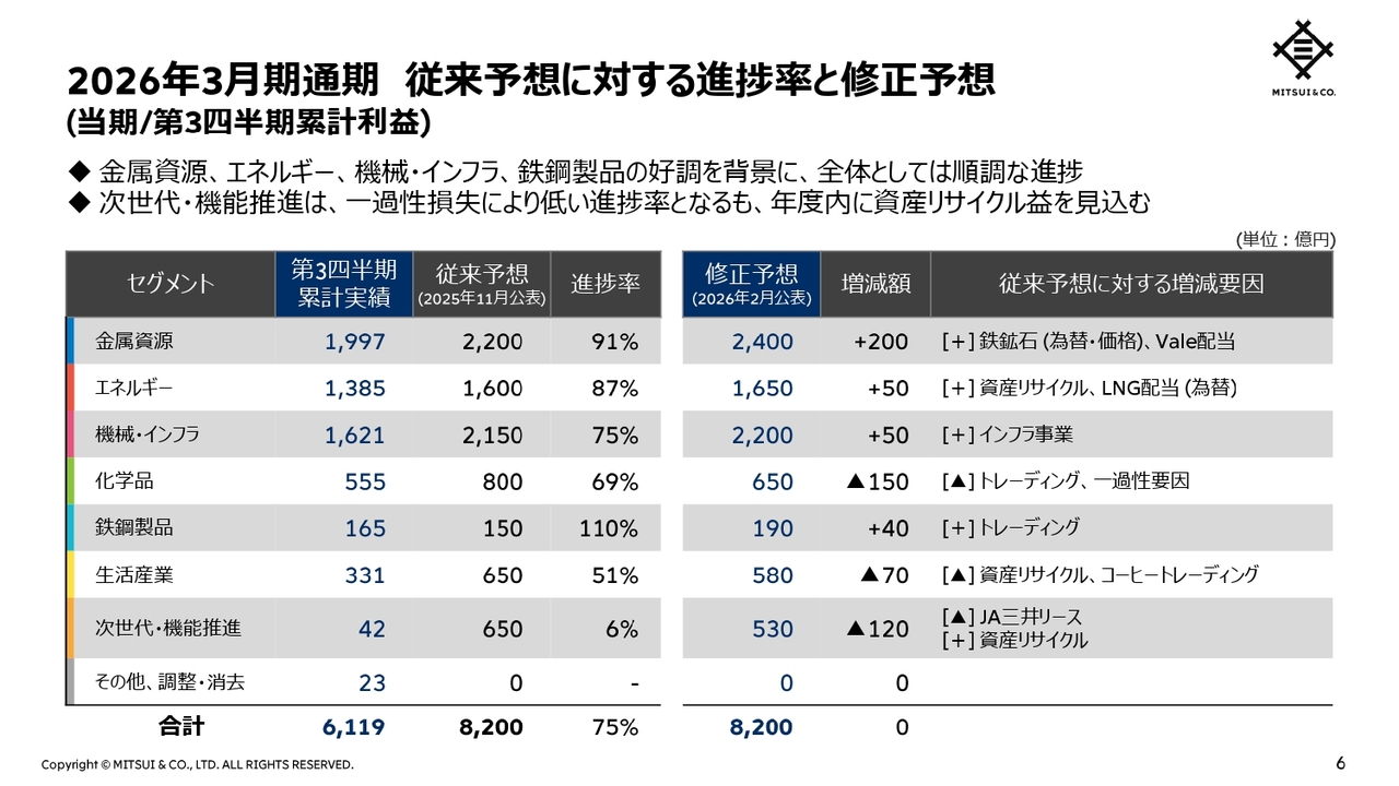 金属資源、エネルギー、機械・インフラ、鉄鋼製品の力強い進捗を背景に、全体として順調な進捗となり、従来予想の8,200億円から変更はありません。