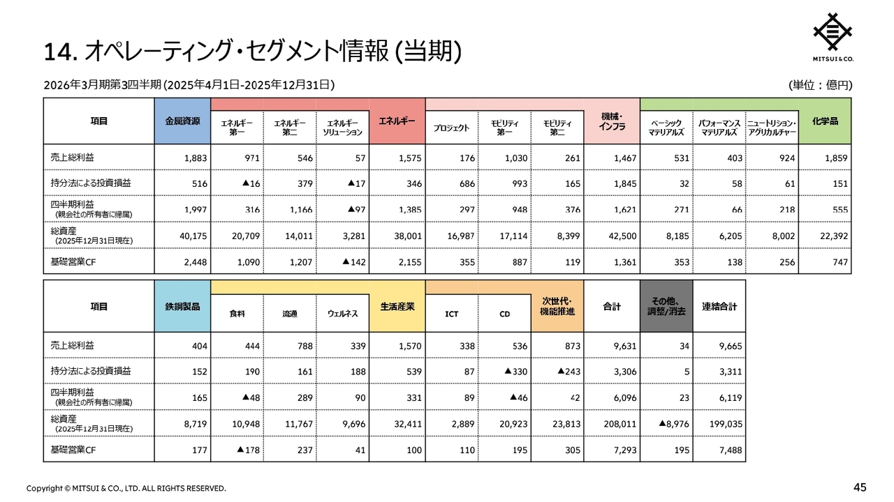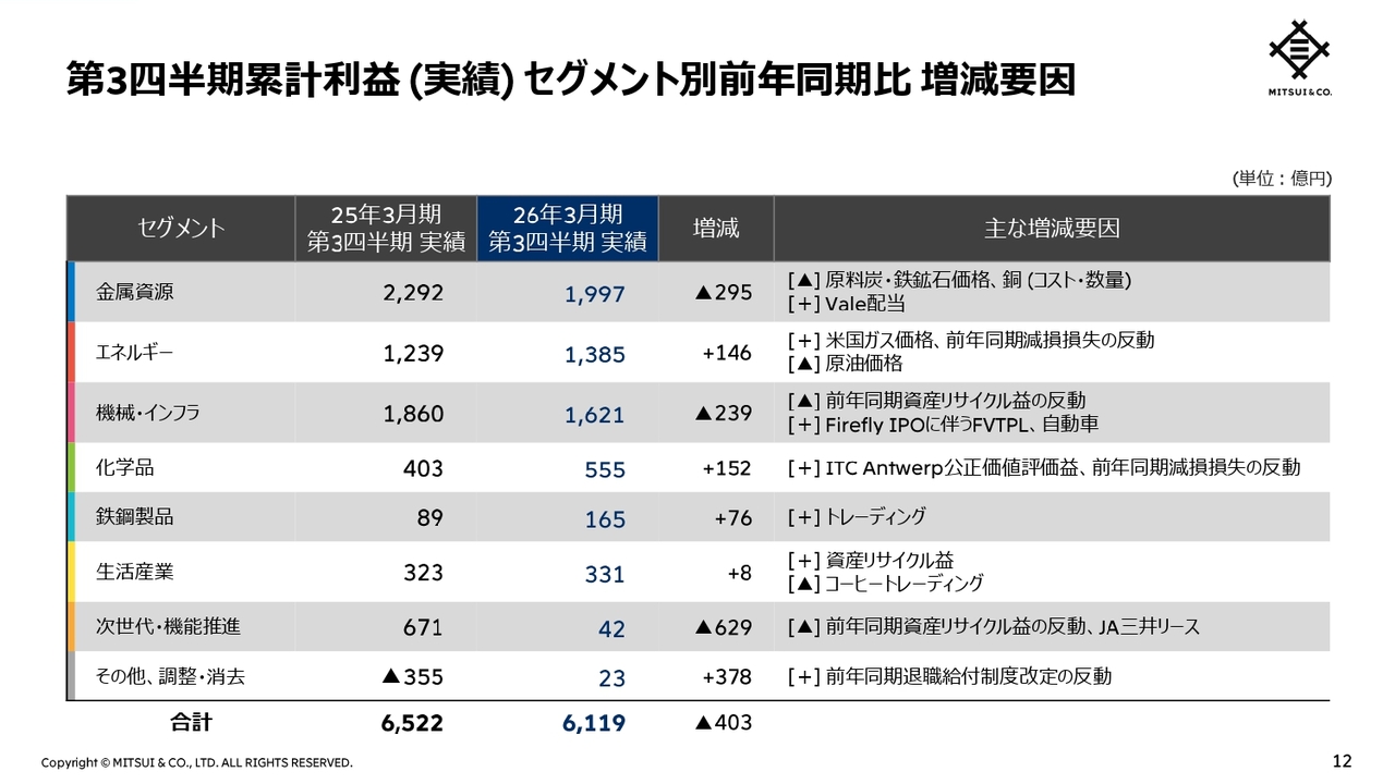 一方で、AIサーバー向けの電子材料や、硫黄・硫酸、燐鉱石のトレーディング等は、数量増を背景に堅調に推移しています。化学品トレーディング全体では、前年同期比の第3四半期累計実績では増益となっているものの、通期計画に対しては未達となる見込みです。