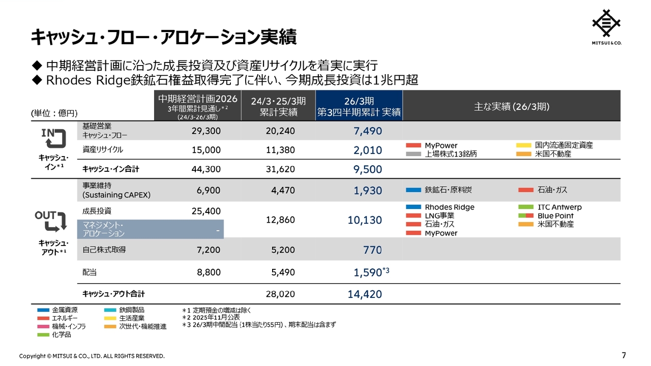 キャッシュ・アウトは、当四半期に、Rhodes Ridge鉄鉱石権益の取得を完了したことに伴い、投融資1兆2,060億円と、株主還元2,360億円を合わせて、1兆4,420億円となりました。