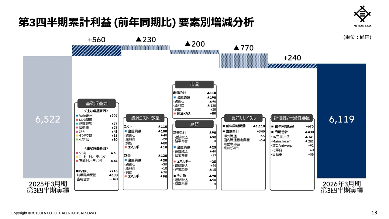 この結果、「市況・為替」は200億円の減益となりました。「資産リサイクル」は、前年同期反動を主因に770億円の減益となりました。