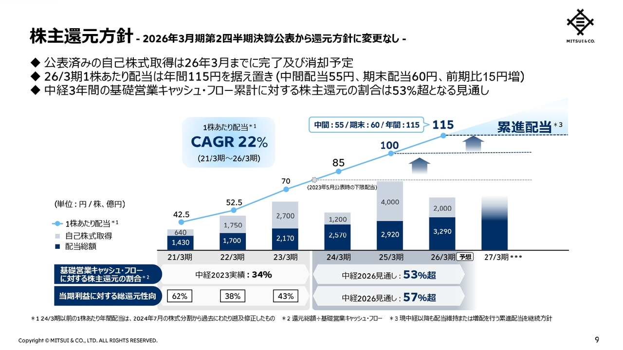 質問者:次期中経でROE向上を狙うためにも、還元強化は必要と思います。例えば2030年に向けて、向こう5年間でいえば、Rhodes Ridge鉄鉱石やモザンビークLNGなど、積み上がりが見えている基礎営業キャッシュ・フローのアイテムが頭の中にあると思いますが、長期の姿を見据えた上で、次期中経で還元強化の姿勢を打ち出すお考えなのか、それともこれまでのとおり投資の状況を見ながらマネジメント・アロケーションを追加還元に徐々に配分していく方向性なのか、現時点で共有いただけるお考えがあれば教えてください。