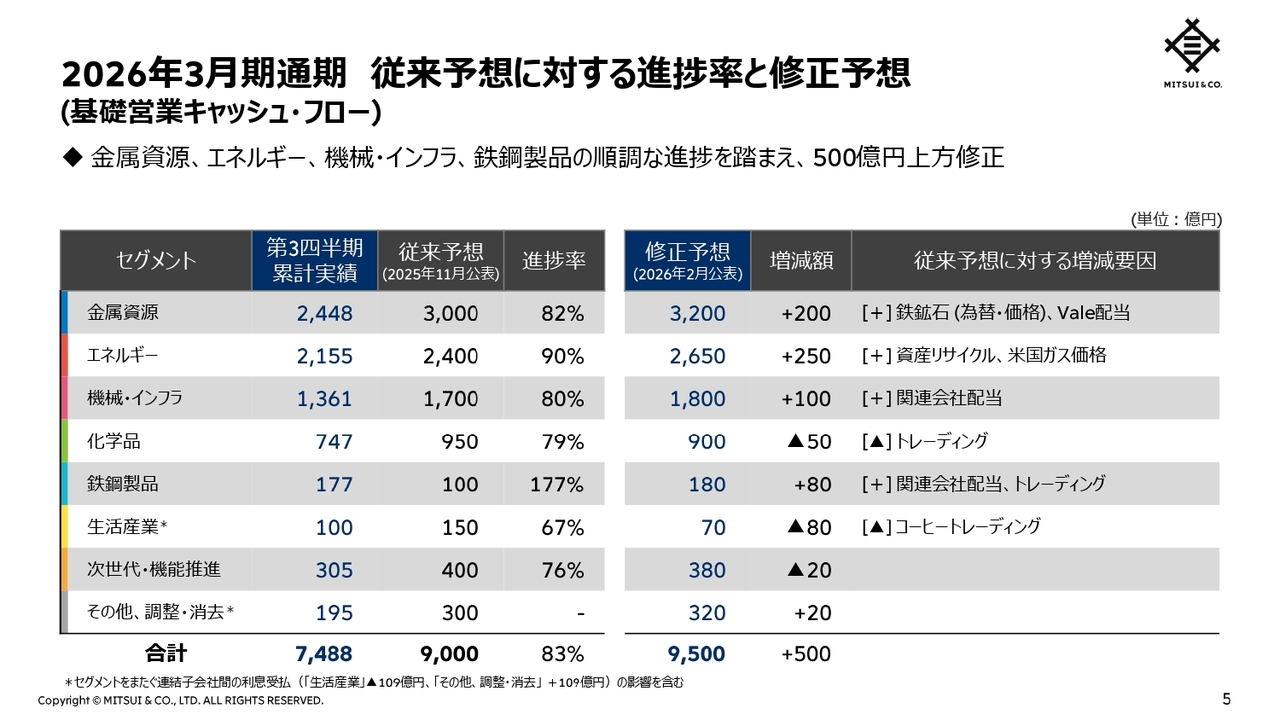 金属資源、エネルギー、機械・インフラ、鉄鋼製品の各セグメントは従来予想に対し80パーセント超と順調に進捗していることを踏まえ、500億円のさらなる上方修正を行い、修正予想を9,500億円としました。