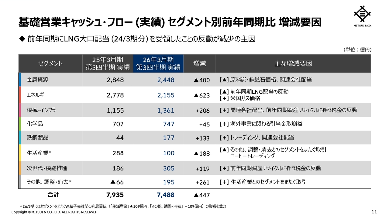 エネルギーでは、米国ガス価格が上昇したものの、前年同期に24年3月期分のLNG配当金を期ズレで入金したことの反動を主因に、623億円減少の2,155億円の獲得となりました。
