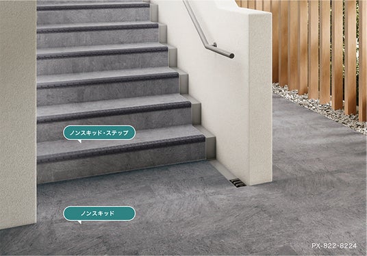 シートと階段用に同柄同色を組み合わせたイメージ。ノンスキッド:PX-822、ノンスキッド・ステップ:PX-8224