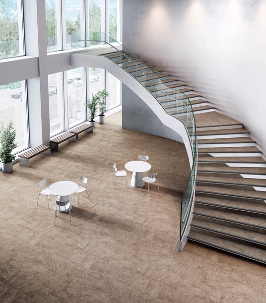 床材「ノンスキッド」と同柄同色の階段用「ノンスキッド・ステップ」を組み合わせた統一感のある空間