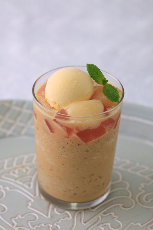 ◇白桃香る フローズンチャイフロート香り豊かなチャイをフローズンフロートでご用意しました。「ピーチ&ローズヒップ」の紅茶で作るオリジナルチャイに、クラッシュした茶葉、ミルクをブレンド。さらに、大粒の白桃果肉とぷるぷるの白桃ゼリー、バニラアイスをトッピングしました。ひんやり冷たい紅茶のフローズンに、白桃と茶葉の華やかな香りが広がる、すっきり爽やかな味わいです。見た目も華やかな夏のドリンクを、ぜひお楽しみください。