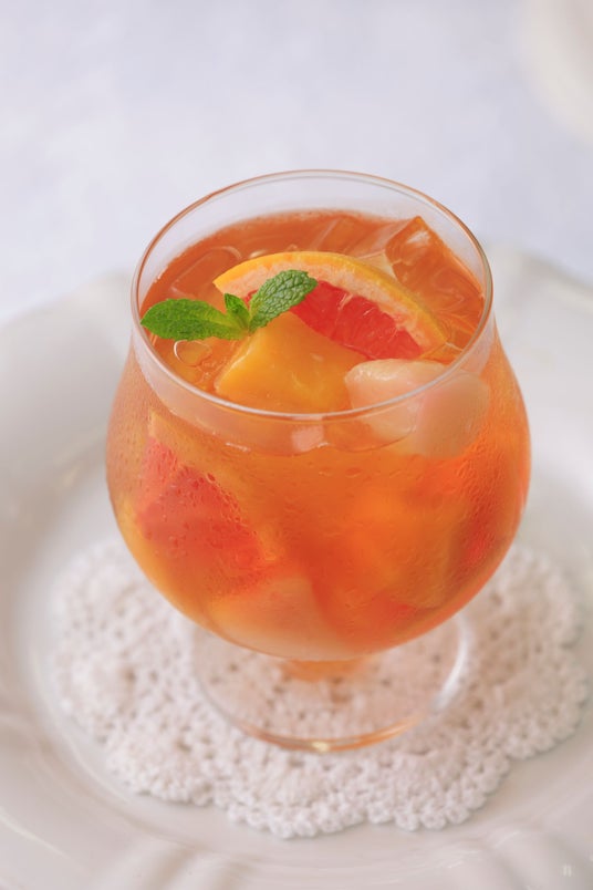 ◇白桃とマンゴーのフルーツティー(アイス)「ピーチ&ローズヒップ」の紅茶をベースにした、甘く優しい桃の香りが特長のフレーバーティーに、大粒の白桃、フルーティーなマンゴー、そして彩り豊かなルビーグレープフルーツを加えました。自家製ティーシロップを加えることで、すっきり爽やかな味わいに。ごろっとした果実の食感と、相性の良いフルーツのハーモニーが楽しめる、夏にぴったりの香り高いフルーツティーをぜひお試しください。