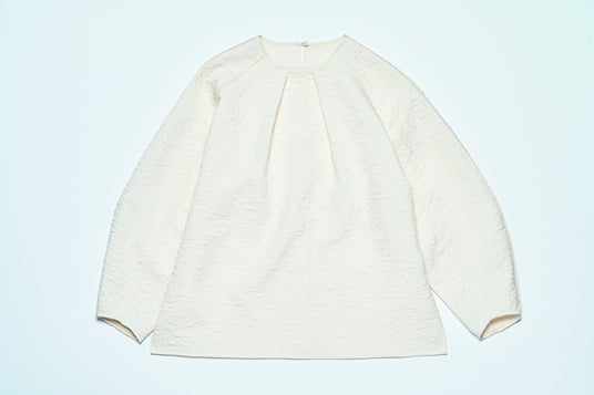 BRING Material(TM)(再生ポリエステル)(※)を使用した、ふくれジャカード生地を使った華やかなブラウス。立体感がありながらも、パイピング使いで膨張しすぎず、程よく締まった印象に。