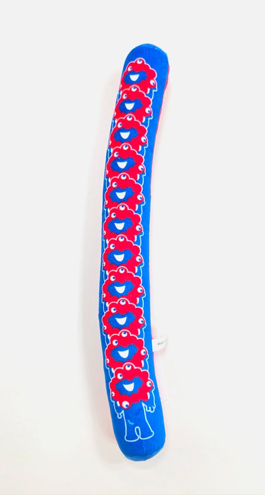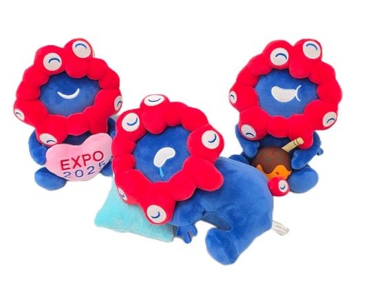 握ると音が鳴るおもちゃはミャクミャクが連なったユニークなデザインにも注目。