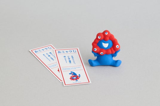 瀬戸焼で作られたミャクミャクの底面のひもを引くとミャクミャクからのお告げが現れるおみくじ。