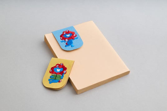 麻生地にミャクミャクの刺繍をあしらった、マグネットで留められるブックマーカーです。