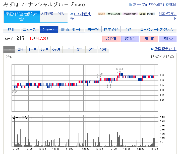 215円高ですか。今日は、みずほを買いました。確定申告に出かけていたので、板を見ていられませんでした。前日の先物気配から、大幅高になるのはわかっていました。何もすることがないだろうと思っていたので、思い切って出かけました。下手に動い... ...続きを読む -