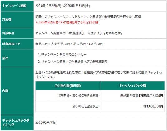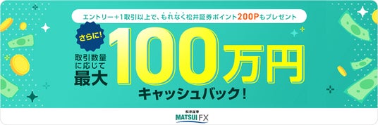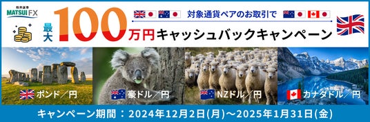 松井証券(本社:東京都千代田区、代表取締役社長:和里田 聰、以下「当社」)は、2024年12月2日(月)より、2024年10月以前にFX口座を開設いただいたお客様を対象に、当社指定の4通貨ペア(豪ドル/円・カナダドル/円・ポンド/円・NZドル/円)の新規建取引数量に応じて、最大100万円をキャッシュバックするキャンペーンを開催いたします。