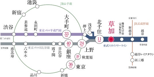 ※東武スカイツリーライン「草加」駅より:「北千住」駅/東武スカイツリーライン急行利用。「上野」駅/東武スカイツリーライン準急利用、「北千住」駅で東京メトロ日比谷線に乗換え。「秋葉原」駅/東武スカイツリーライン準急利用、「北千住」駅でつくばエクスプレスに乗換え「東京」駅/東武スカイツリーライン準急利用、「北千住」駅で東京メトロ日比谷線に乗換えて「上野」駅でJR上野東京ラインに乗換え。「大手町」駅/東武スカイツリーライン区間急行利用、「北千住」駅で東京メトロ千代田線に乗換え。「銀座」駅/東武スカイツリーライン区間急行利用、「北千住」駅で東京メトロ日比谷線に乗換え。