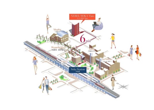 VARIE2のくまざわ書店で話題の文庫本を買ったり、VARIE1のスターバックスで安らぎのカフェタイムを楽しんだり、電車を降りてすぐ、私の心を満たすリラックスタイムが始まります。駅を出ると駅前に草加マルイ(徒歩4分・約320m)、イトーヨーカドー草加店・アコス専門店街(徒歩5分・約360m)等、大規模商業施設が揃います。最新のファッションからグルメなど多彩な店舗が生活を彩ります。駅徒歩6分の立地だからこそ、駅前利便を身近に享受できます。