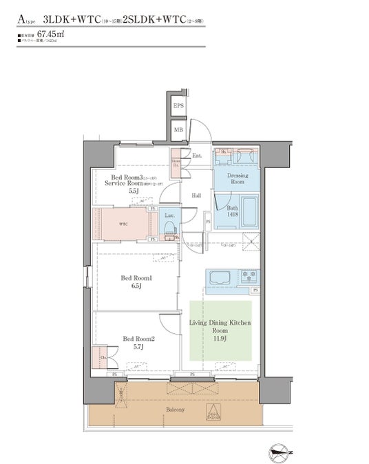 専有面積 : 52.54平方メートル ~67.45平方メートル