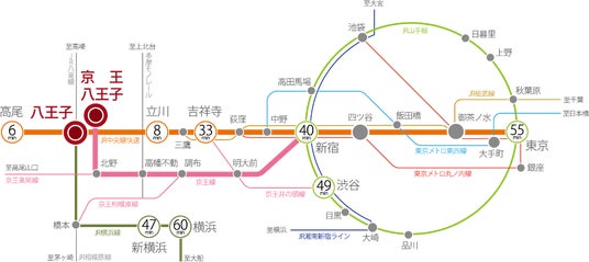 JR「八王子」駅からJR中央線、横浜線、八高線の各線、また「京王八王子」駅から始発の京王線が利用可能。中央線では快速、特別快速、さらに中央本線や特急も利用でき、立川、吉祥寺、新宿、東京方面への快適なアクセスを実現。通勤や通学はもちろん、レジャーへのお出かけも便利です。