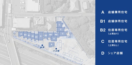 大小規模が異なる店舗兼用住宅、土間付き住宅、シェア店舗に加え、井戸のある広場、バス待合所等からなる複合施設であり、かつての“水と人々の営み”をコンセプトとして継承しながら、店舗出店者を中心としたお住まいいただく方とともに、地域コミュニティの活性化を目指します。