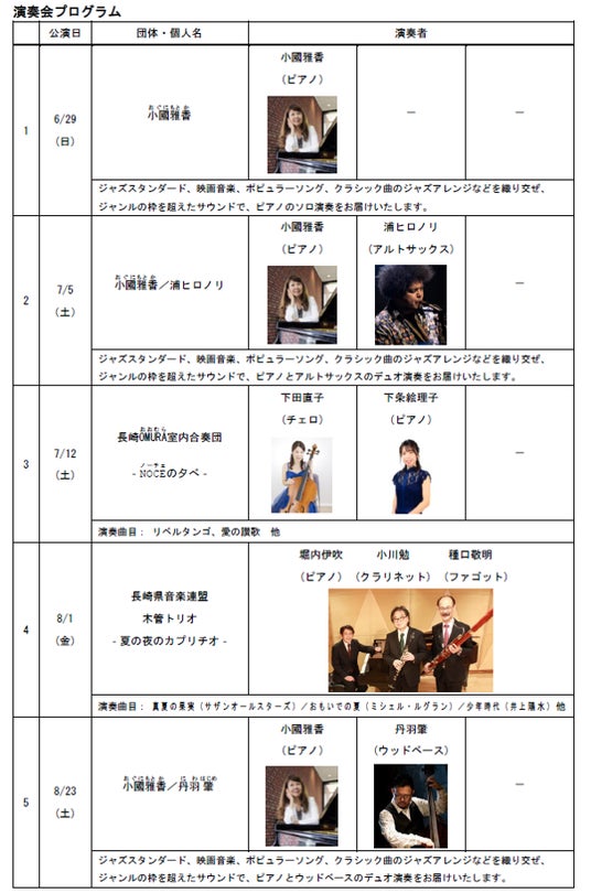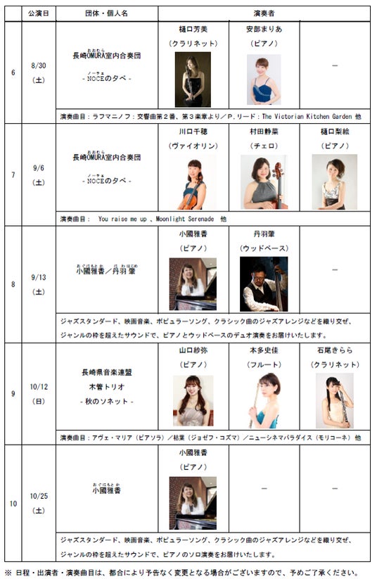 長崎マリオットホテル(長崎県長崎市、総支配人 吉満啓一郎)は、2025年6月から10月にかけて、地域の音楽家の皆さまにご出演いただく全10回の音楽演奏会を開催する運びとなりましたので、下記の通りお知らせいたします。美しい音楽の調べによって、ホテルレストランでお過ごしいただくひとときがさらに豊かなものとなることをお約束いたします。この機会に、ぜひ長崎マリオットホテルへお越しください。