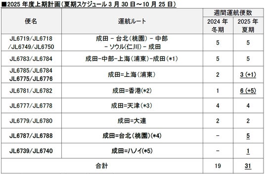 (*1)JL6783:成田 - 中部 - 上海(浦東)、JL6784:上海(浦東) - 成田