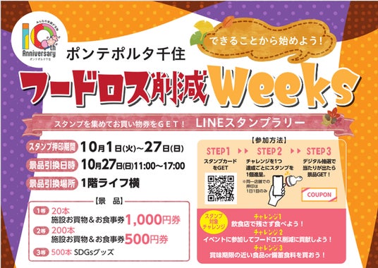 この度実施するスタンプラリーは、「ポンテポルタ千住」が実施するフードロス削減を啓発するイベントの一環として開催されます。対象の飲食店で美味しく食べきるチャレンジや食品ロスクイズラリーなどイベントへの参加、賞味期限の近い食品や備蓄食料の購入など、フードロス削減につながるチャレンジをご用意しています。