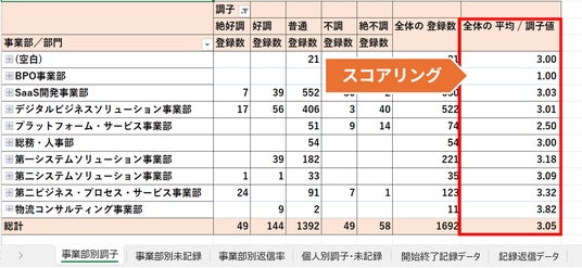 従業員のサーベイの回答状況を個人別、部門別に抽出しスコアリングします