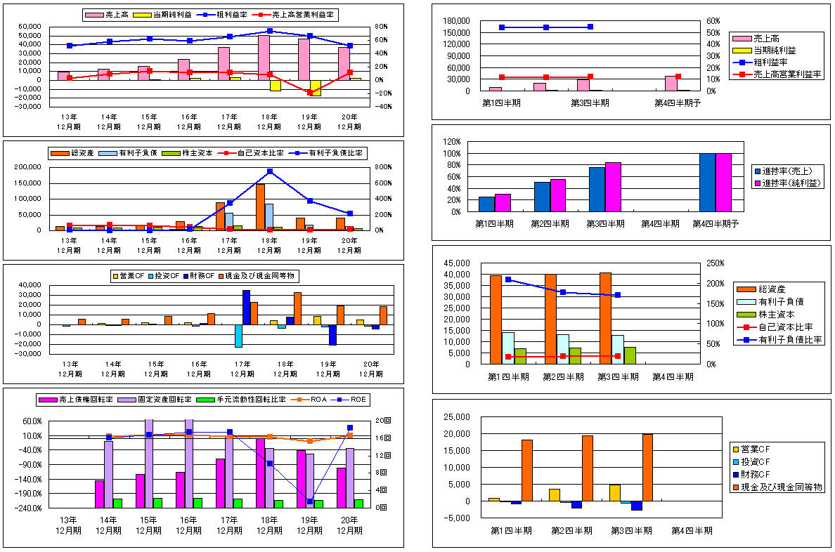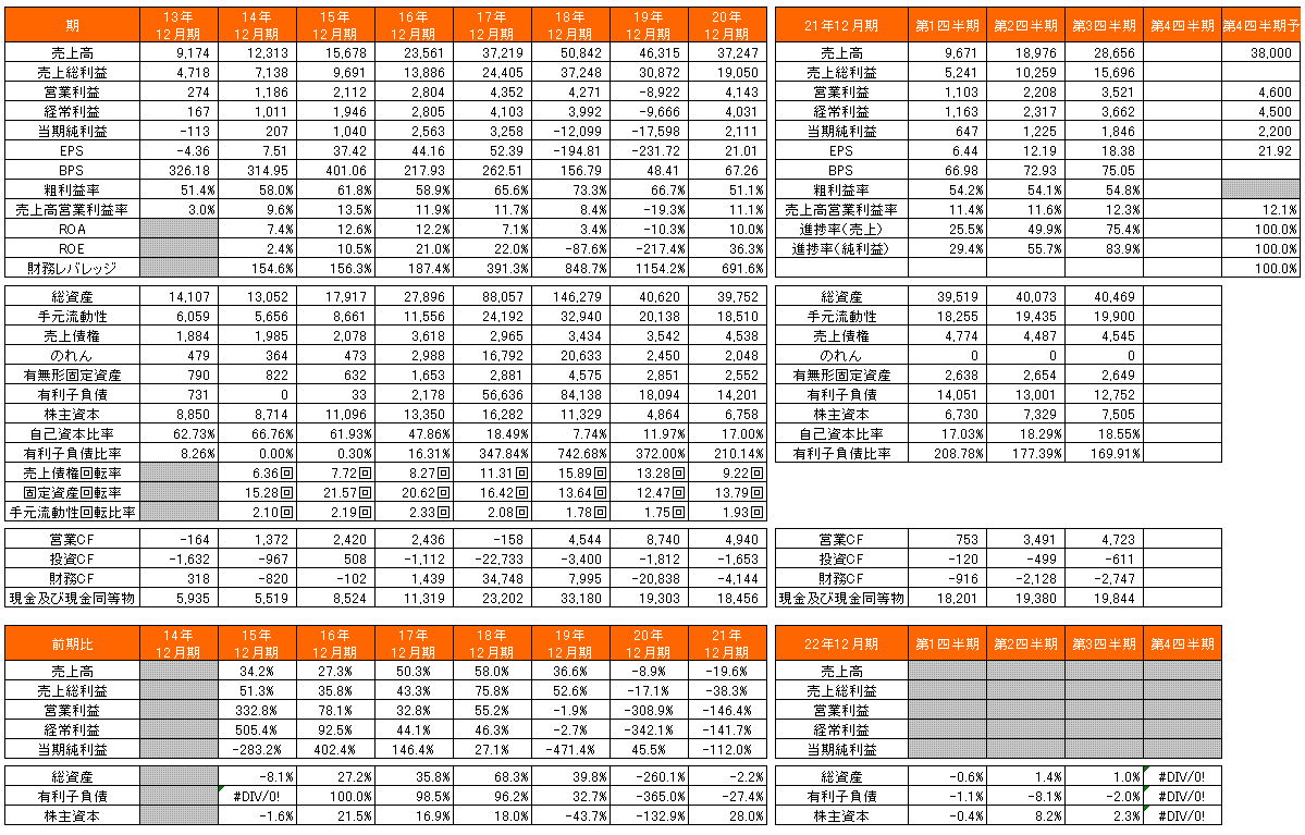 過去の経営成績を見ると、粗利益率は50%超を維持している。19年12月期はのローン・クレジット事業の完全撤退に伴う損失及びネットカード㈱債権の貸倒引当金繰入額によって大幅に自己資本を既存しため、財務基盤の強化を行った。それ以降は、得意分野に経営資源を集約しているので安定している。18年12月期の有利子負債比率742.68%をピークに、21年12月期第三四半期後に169.91%まで削減している。