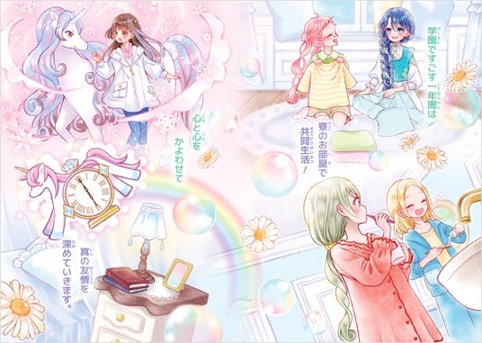ルーナは、魔法の学園「ユニコーン・アカデミー」に入学し、はじめての寮生活を体験します。寮のお部屋は「ダイヤモンドルーム」と名づけられた5人部屋。