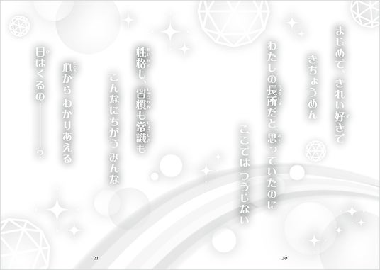 ▲「はじまりのポエム」のページ。ぼかしを多用した淡めのデザインは、女の子の揺れる心を伝えています