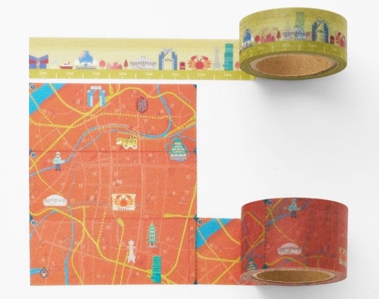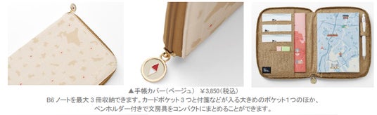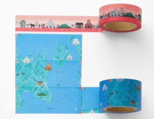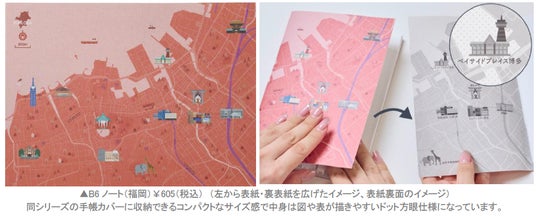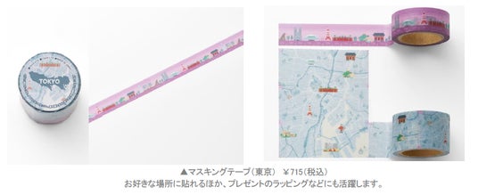 ▲「タビマップシリーズ」B6ノート、マスキングテープ(東京、横浜、京都、大阪、福岡、長崎、長崎五島の7エリア)と手帳カバー(ベージュ、ネイビー、カラフルの3種)を展開