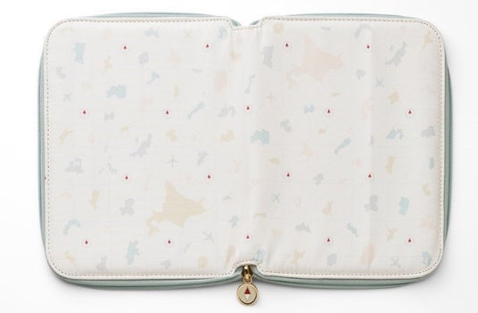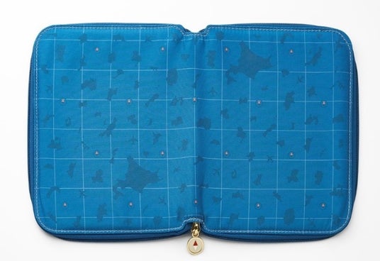 47都道府県のシルエットのほか、コンパスと飛行機のアイコンが散りばめられたデザインです。アイテムは、手帳カバーで、ファスナーのスライダーの持ち手がコンパスのデザインになっています。色は、ベージュ、ネイビー、カラフルの3色展開です。